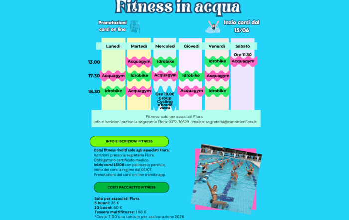 Fitness in Acqua 2026 Torna il programma estivo di fitness in acqua con corsi dedicati agli associati Flora. Le attività iniziano dal 15 giugno, con un calendario settimanale ricco di proposte tra acquagym, idrobike e group cycling in vasca. Le [...]