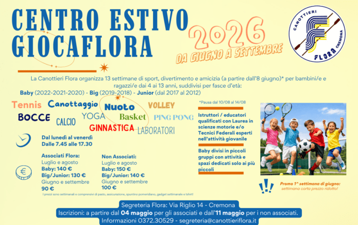 Centro Estivo Flora 2026 La Canottieri Flora organizza 13 settimane di centro di avviamento allo sport per bambini/e e ragazzi/e dai 4 ai 13 anni suddivisi per fasce d’età: Baby nati nel 2022-2021-2020 Big nati nel 2019-2018 Junior nati dal [...]