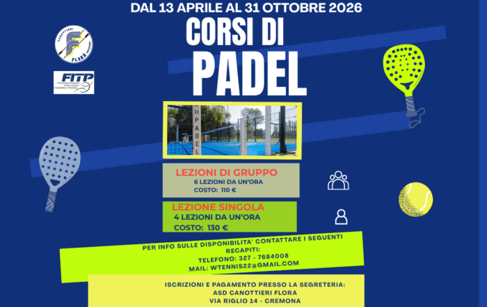 CORSI DI PADEL Dal 13 aprile al 31 ottobre 2026 Lezioni di gruppo - 6 lezioni da un'ora costo euro 110 Lezione singola - 4 lezioni da un'ora costo euro 130 Per info sulle disponibilità contattare i seguenti riferimenti: Telefono: [...]