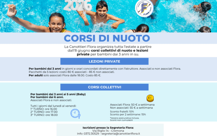 Corsi di Nuoto Estate 2026 Per l’estate 2026, la Canottieri Flora propone corsi di nuoto collettivi e lezioni private per bambini (dai 3 anni) e adulti. Le attività partono dall’8 giugno. Lezioni private: Per bambini dai 3 anni in giorni [...]